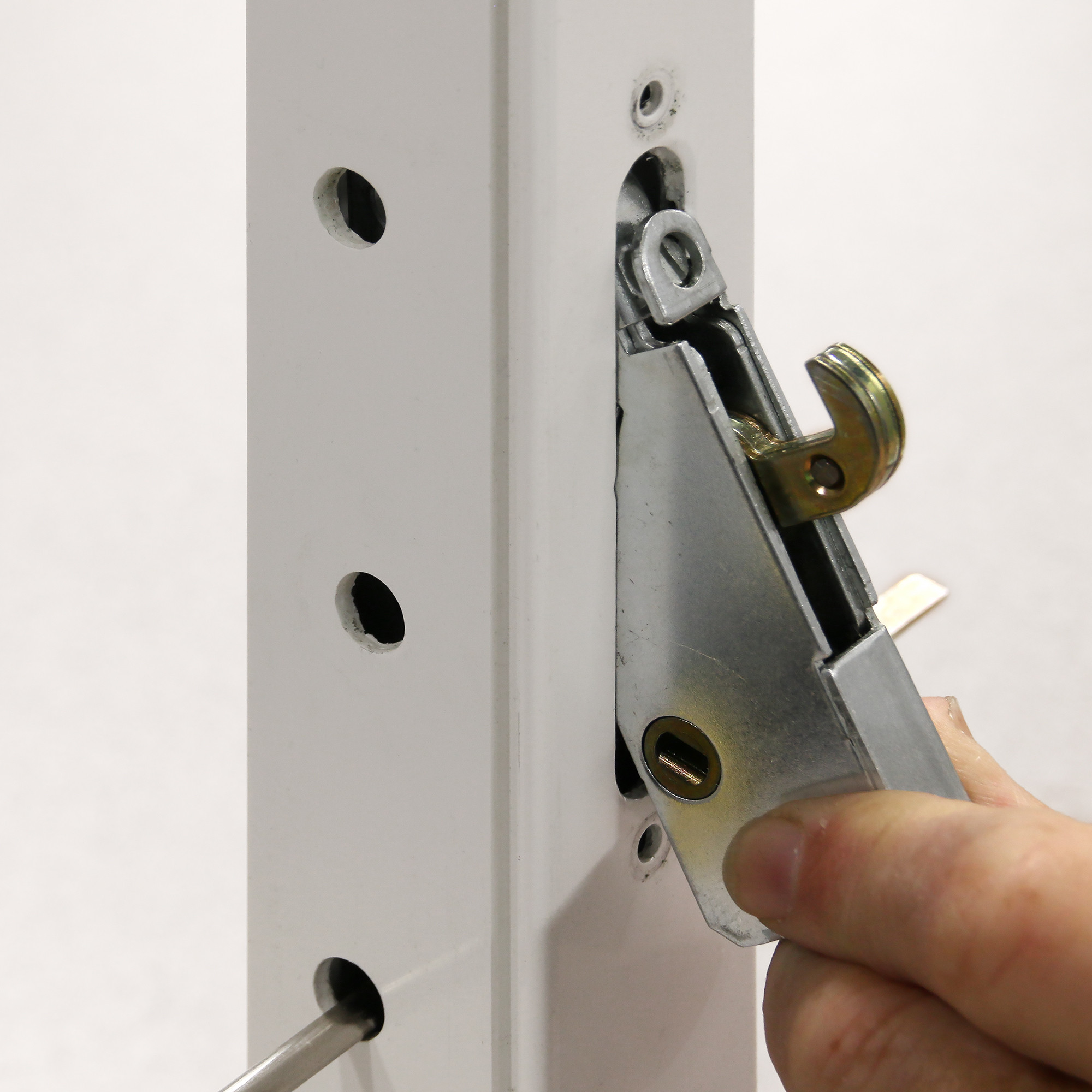 842860| Mortise Lock - Adjustable, Spring-Loaded Hook Latch Projection for Sliding Patio Doors Constructed of Wood, Aluminum and Vinyl, 3-11/16”, 45 Degree Keyway, Round Face