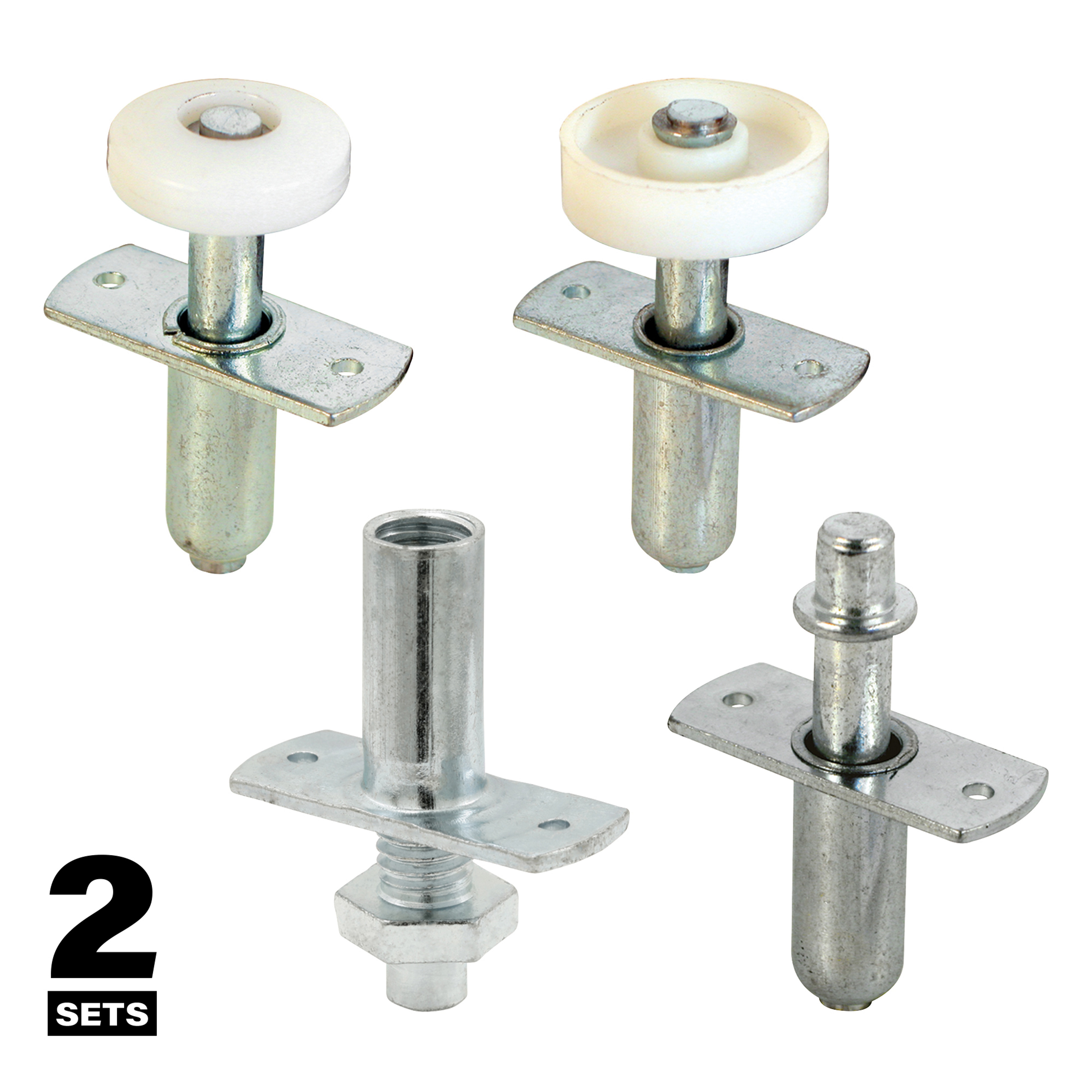 Includes one spring-loaded Prime-Line part N 6611 top roller guide with a 3/4 inch diameter rounded plastic roller, and one spring-loaded Prime-Line part N 6614 top roller guide with a 7/8 inch diameter flat plastic roller